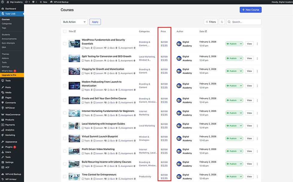 By default, Digital Academy Fortune comes with ready made courses already configured for you. The frontend version includes 35 courses, while the upgrade version includes 65 courses. Each course already has a linked WooCommerce product with pricing set.