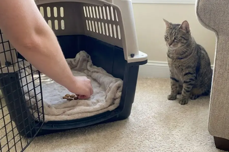 – The Treat Lure: Start by placing treats near the carrier entrance. Once your cat is comfortable eating those, move the treats just inside the door, and then gradually further into the back.