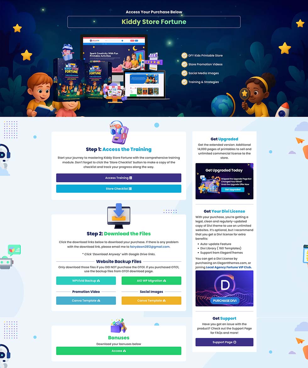 On the download page, located just below the training link, you’ll find all the necessary download and access links for the files and materials included in Kiddy Store Fortune. After you’ve navigated through the training and have a solid understanding of the system, you can return to this page to download your files. This ensures you have everything you need to successfully launch and manage your store.