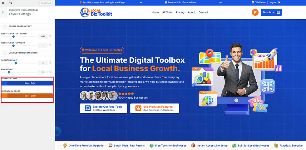 With Local Toolkit Fortune, a global color system has been set up using two core colors: Primary and Secondary. This allows you to easily update the site’s color scheme across most modules.